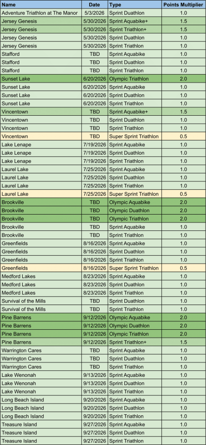 Points for the series will be tallied after each race and the leaders will be posted on the Grand Prix Standings section of our website. If an athlete enters multiple categories (Triathlon, Duathlon, Aquabike) during the season, points will accrue separately in each category. After the last race of the season, the prizes will be awarded to the top male and female athletes who have earned the highest total points. Age group winners will receive awards for the highest total in each age group. There are no double-dipping or duplicate awards. Kayak and Non-Multisport events do not gain points. Overall winners are ineligible for age group awards.